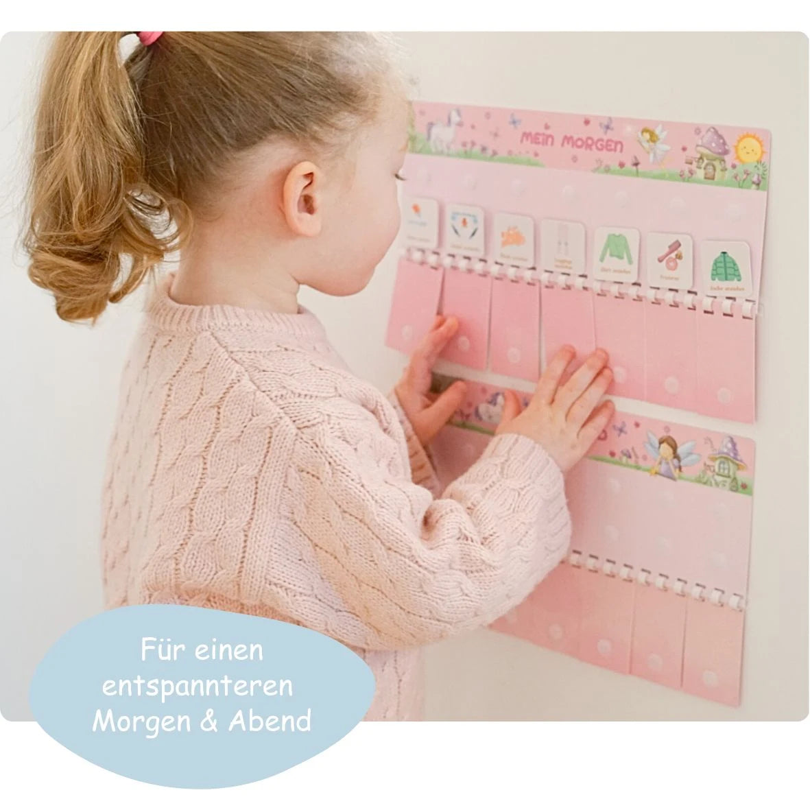 Du nutzt den Planer gemeinsam mit Deinem Kind, um den Morgen und Abend strukturiert zu gestalten. Dabei entscheidet Dein Kind selbst, in welcher Reihenfolge es die Aufgaben erledigen möchte – ganz im Sinne des Montessori-Ansatzes. Nach jeder abgeschlossenen Aufgabe klappt es die entsprechende Klappe eigenständig nach oben. So entsteht ein motivierender, visuell geführter Ablauf, der Dein Kind Schritt für Schritt durch den Tag begleitet – und bislang herausfordernde Situationen plötzlich kinderleicht erscheinen lässt.