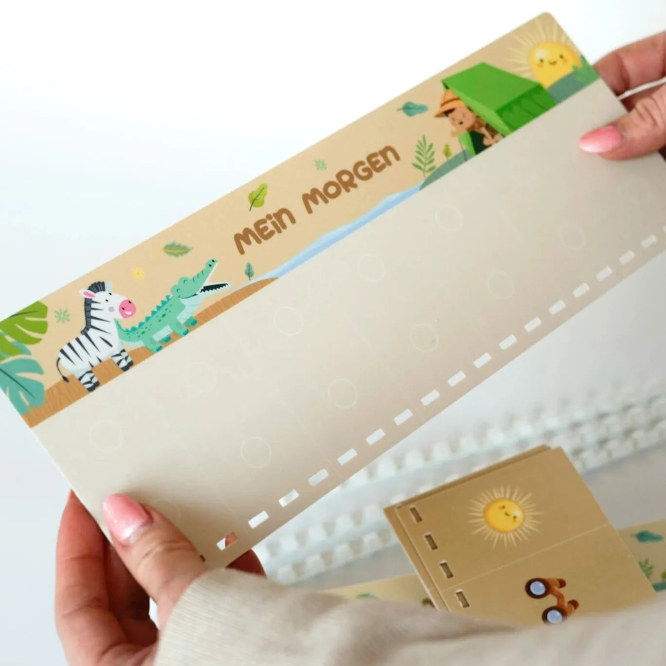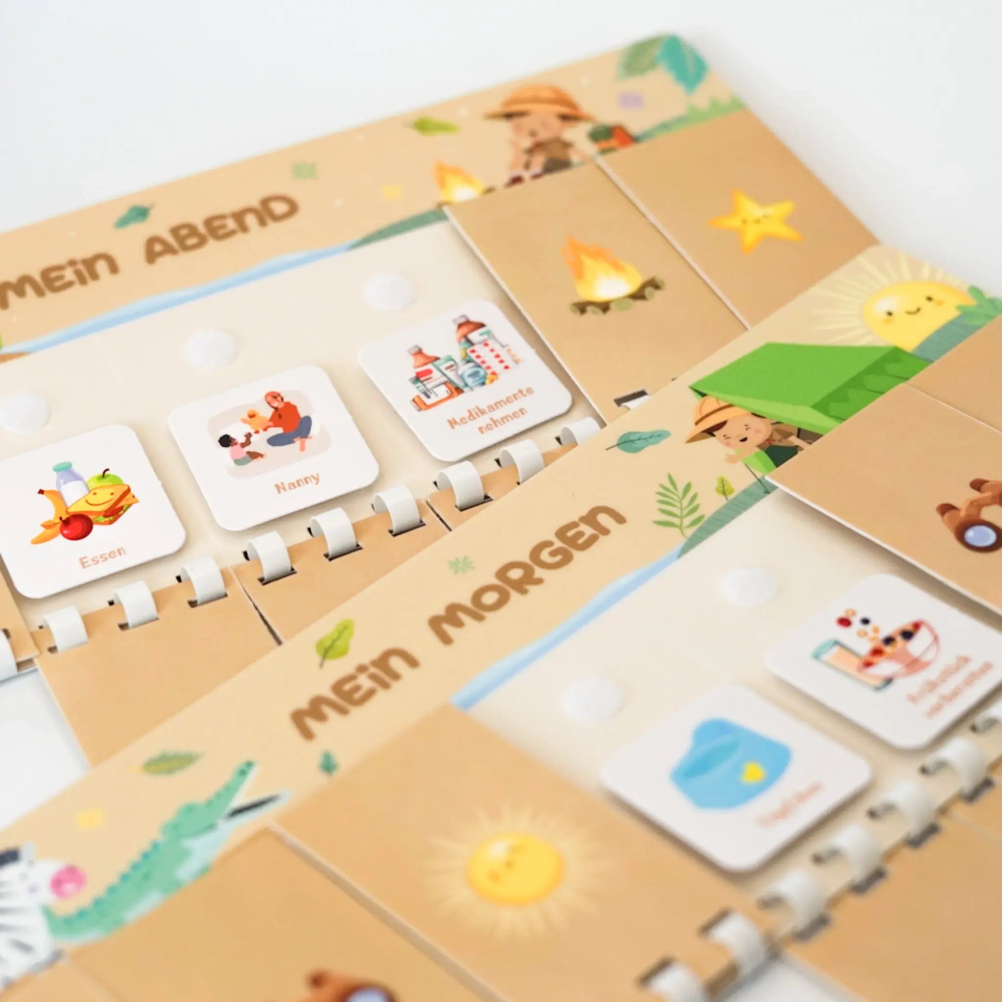Du nutzt den Planer gemeinsam mit Deinem Kind, um den Morgen und Abend strukturiert zu gestalten. Dabei entscheidet Dein Kind selbst, in welcher Reihenfolge es die Aufgaben erledigen möchte – ganz im Sinne des Montessori-Ansatzes. Nach jeder abgeschlossenen Aufgabe klappt es die entsprechende Klappe eigenständig nach oben. So entsteht ein motivierender, visuell geführter Ablauf, der Dein Kind Schritt für Schritt durch den Tag begleitet – und bislang herausfordernde Situationen plötzlich kinderleicht erscheinen lässt.